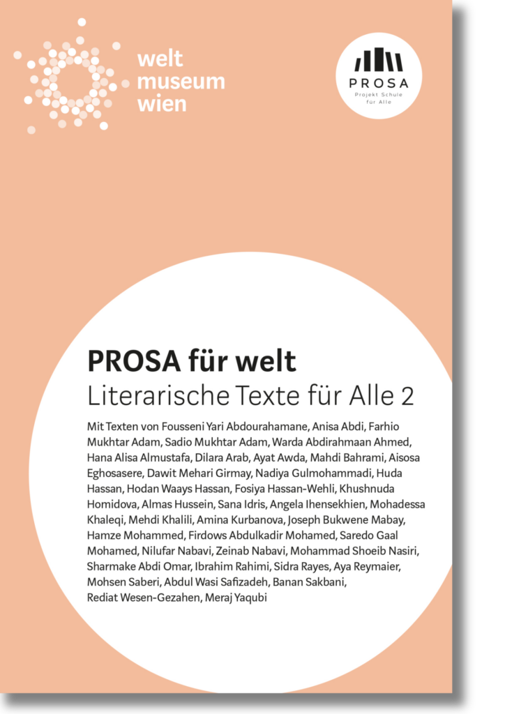 For the book project PROSA für Welt, the school is now working together with the Weltmuseum Wien. Since autumn 2021, active and former learners have started a writing process that approaches the Weltmuseum and the exhibition objects. The texts produced here will appear in another book, which can be used as learning material both in the World Museum and in the PROSA school, and through the sale of which new school places will be financed.